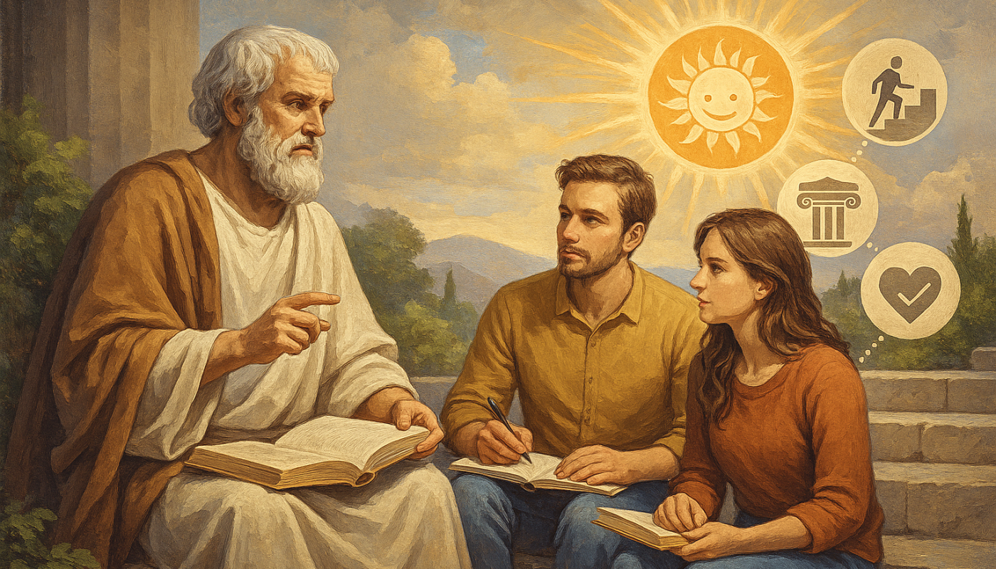 Desde Aristóteles, la felicidad se concibe como el fin último de la vida humana, alcanzable mediante la virtud y la excelencia moral. Platón la eleva a bien supremo, lograble con justicia y armonía interior, que consiste en equilibrar la parte racional, la parte impulsiva y la parte deseante del alma. Aristóteles lo resume de manera precisa: la felicidad es el bien supremo que se busca por sí mismo. Bajo esta mirada, la búsqueda de la felicidad no es un estado pasajero ni puede depender de placeres momentáneos, sino de un esfuerzo constante de desarrollo personal. Aquí se abre paso la noción de eudaimonía.